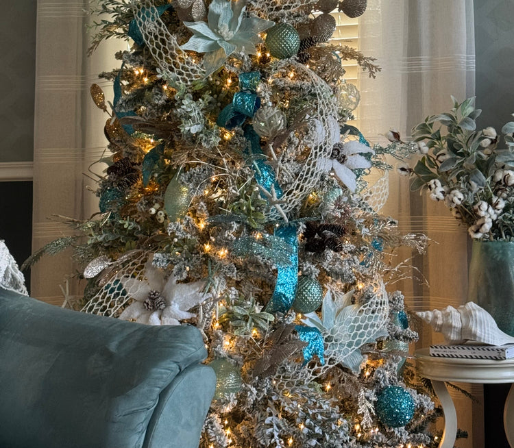 Seaside sparkle and holiday glee! Adorning our tree with coastal charm and ocean-inspired ornaments, because even Christmas dreams can have a splash of the sea. Be inspired by our beachy, yet sophisticated Seas and Greetings tree. Our vibrant blue tones, nautical adorned ornaments, and seaside embellished garlands are sure to make this tree a staycation!